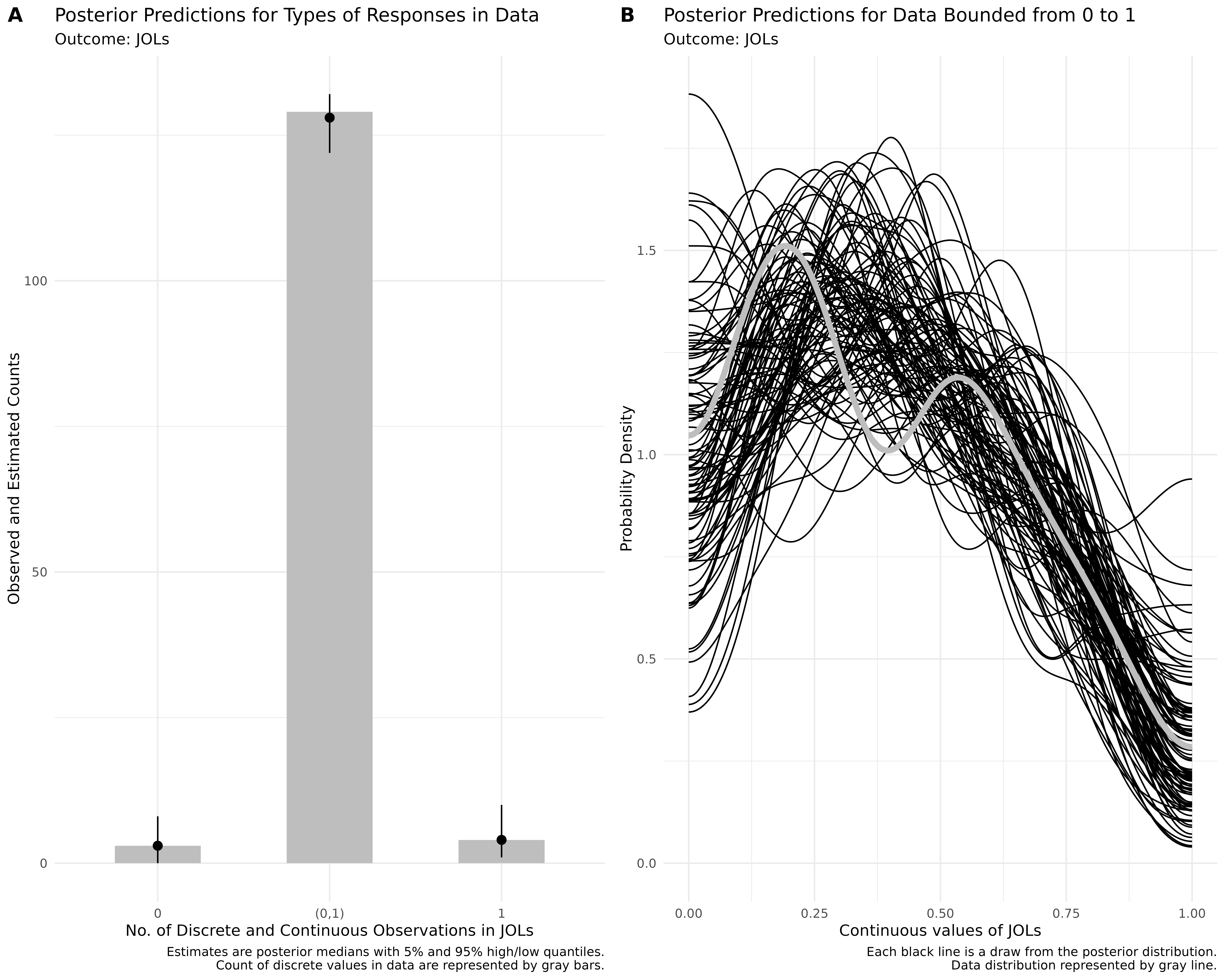 Comparing our analyses with those of Wilford et al. (2020), we show that traditional approaches (e.g., t-tests) can sometimes converge with more flexible modeling frameworks. For example, in Case Study 2, both we revealed an effect of fluency on metamemory judgments, with fluent instructors receiving higher JOLs than disfluent instructors. However, in other cases, traditional methods can lead to misleading or incomplete inferences. In Case Study 1, using a Gausisan model, we found strong support for the effect being non-zero. However, we noted issues with Gaussian analysis. Applying beta regression and its extensions revealed important nuances that were not captured by simpler methods.